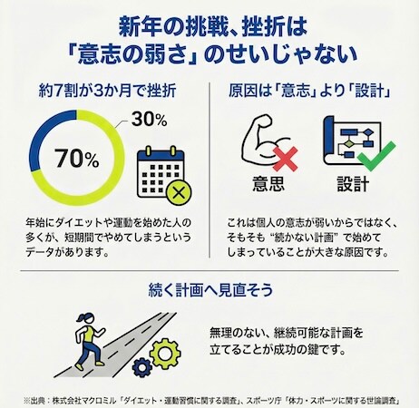 この結果は「意志が弱いから続かない」のではなく、続かない設計のまま始めてしまっている人が多いことを示しているという。