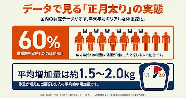 国内調査によると、年末年始に体重が増えたと感じている人は約6割にのぼり、平均増加量は約1.5〜2.0kgとされている(※1)。