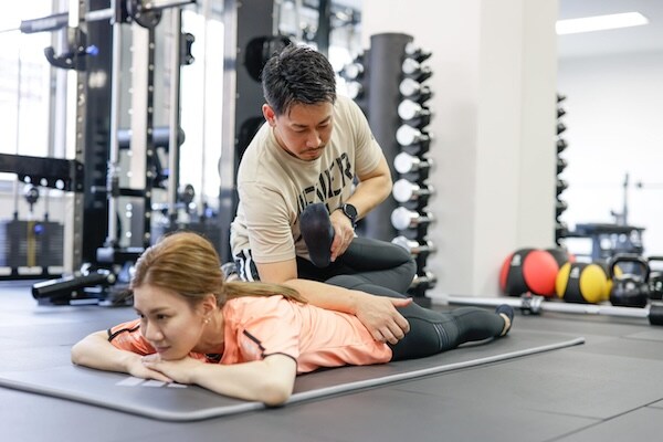 30分間のトレーニングの流れは、その日の体調や気になる部位をヒアリングし調整する「体調チェック(約2分)」、軽い動作で身体を整える「ウォーミングアップ(約3分)」、そして下半身や体幹、二の腕など気になる部位を中心に実施する「メイントレーニング(約20分)」で構成されている。