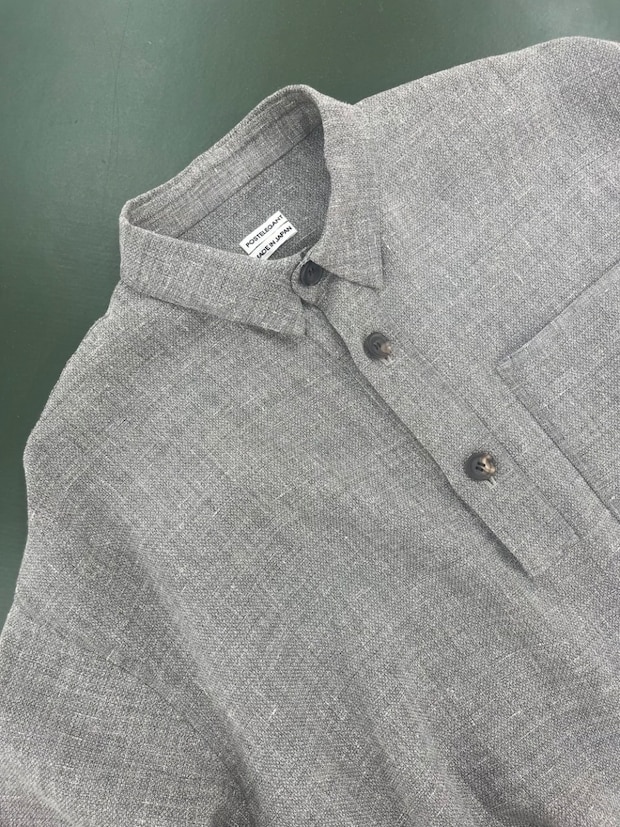 「ユニセックスでアイテムを展開しているポステレガント。リネン×ウールの素材をリバー製法で仕上げたポロシャツは、上質な素材と仕立てのよさが感じられ、半袖ジャケットのような佇まいが魅力です」リネンポロ¥77,000(ポステレガント)