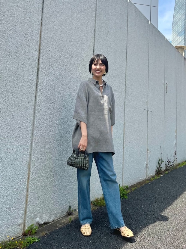 リネンポロ¥77,000(ポステレガント)、デニム¥49,500(ビー サイド)、パールネックレス¥181,500(ソフィー ブハイ/共にエスケーパーズオンライン)、バッグ¥69,300(へリュー/ショールーム セッション)、サンダル¥78,100(へリュー/へリュージャパン オフィシャルオンラインストア)、その他は本人私物