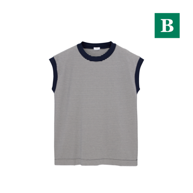 着こなしに奥行き感をもらたすボーダーカットソー。ピッチが細かい分、無地感覚で使えて便利。スリーブレスながら肩幅広めの作りなので安心。ノースリーブトップス¥12,100(ロエフ/エイチ ビューティー&ユース)