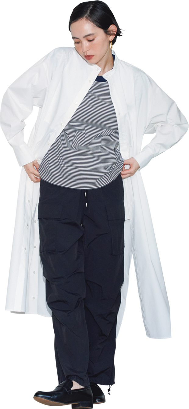 ロングシャツを主役に羽織りのようにコーディネート。モノトーンを軸に色数を絞ることで、クリーンでミニマルな着こなしを実現。ワークパンツの裾はあえて絞らずにローファーを合わせ、カジュアルななかにもきちんと感を演出。どこかマニッシュな雰囲気が◎。