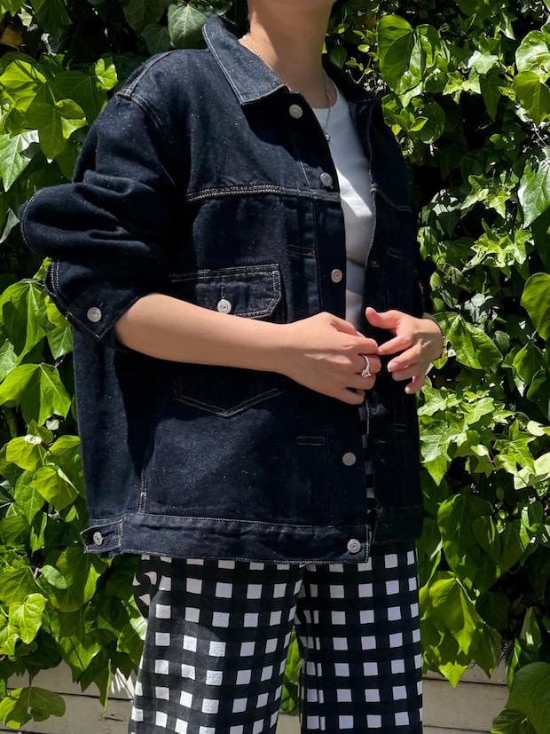 「メンズアイテムが好きでよくアウターやトップスをコーディネートに取り入れるのですが、今回はボリュームのあるリーバイスの濃紺デニムジャケットをゆったりと羽織り、シンプルなTシャツと遊び心のあるブロックチェックパンツでクリーンなスタイリングに。メンズアイテムを着るときはスカートやヒールのあるパンプスなど何か1点フェミニンなアイテムを選ぶと可愛くまとまります」