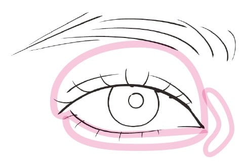 二重幅と下まぶたの目尻側に手持ちのブラウンシャドウを入れておいてから、SUQQUのクリームシャドウをアイホール全体と下まぶた、目頭にくの字形に入れる。これで目元に自然な輝きが!