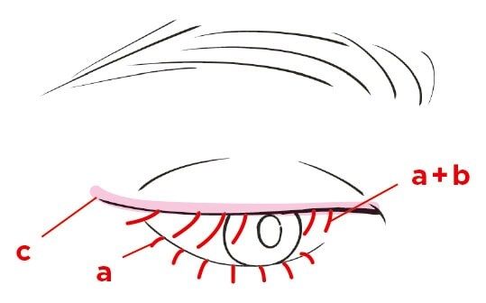 上の目のキワの粘膜にcの焦茶を細く入れる。目頭の起点から目尻の終着点まで。さらに上まつ毛(目尻以外)にビューラーをかけたら上下のまつ毛にaを塗り、上まつ毛にはbも重ねる。