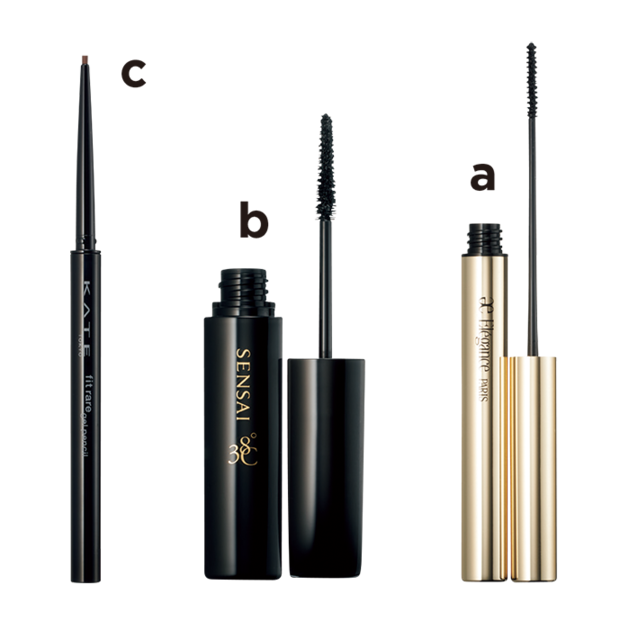 a上向きカールが1日続く。エレガンス カールアメイジング マスカラ BK10 ¥4,400(エレガンス コスメティックス) bまつ毛がぎゅんと伸びる、スムースストレッチング処方。センサイ ラッシュレングスナー 38℃ ¥4,400(カネボウ化粧品) cケイト レアフィットジェルペンシルN BR-2 ¥1,210※編集部調べ(カネボウ化粧品)