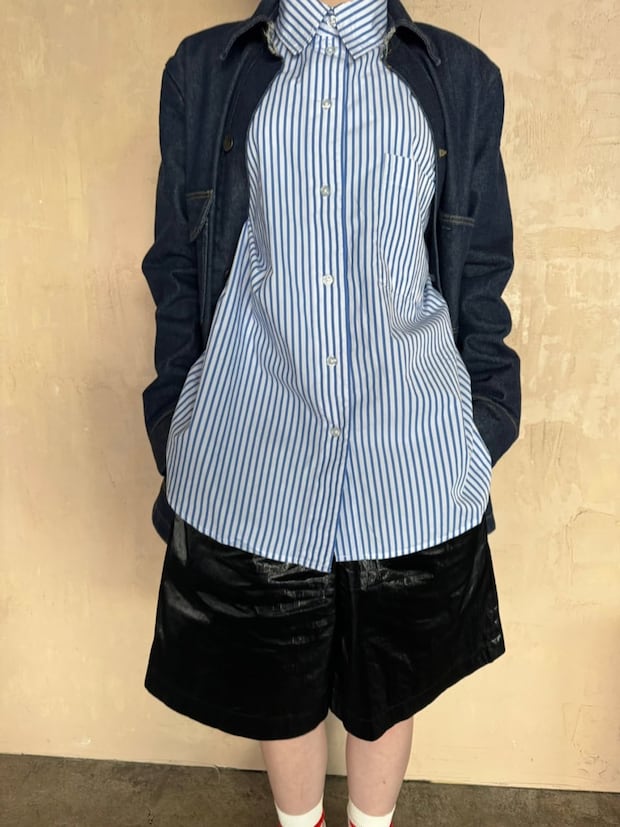「ドリス ヴァン ノッテンのシャカシャカハーフパンツはあえてメンズを着用することでこなれたカジュアルスタイルに。これから夏にかけて大活躍な予感です」Maison Margielaのデニムジャケット、Dries Van Notenのハーフパンツは本人私物