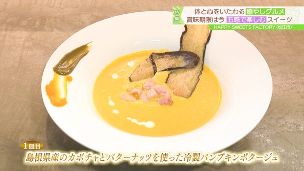一皿目 島根県産のカボチャとバターナッツを使った冷製パンプキンポタージュ
