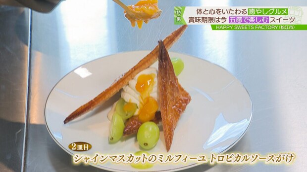 二皿目 シャインマスカットのミルフィーユ トロピカルソースがけ