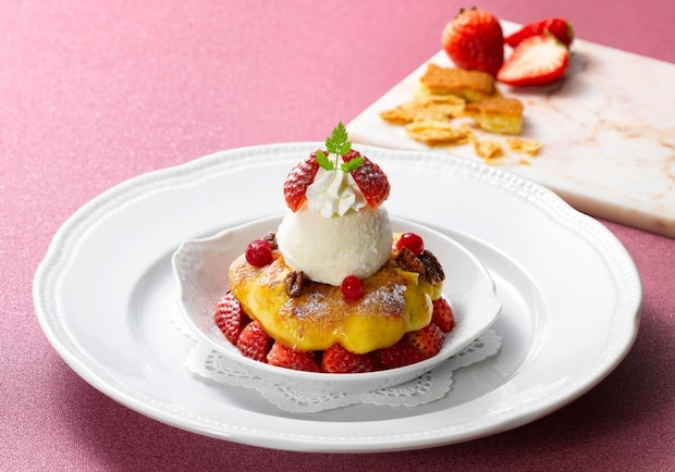 新商品「苺のパイ・ア・ラ・モード」(1,408円)と「苺のトライフルパフェ仕立て」(1,188円)に加え、昨年よりフレッシュ苺を1粒増量した「苺のブリュレパフェ」(1,628円)を展開。価格表記はいずれも税込。