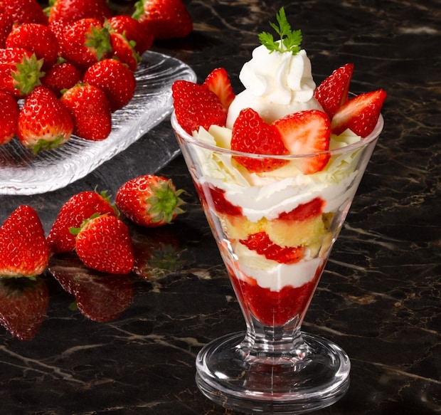 イギリス発祥のデザート「トライフル」をイメージした、ケーキ仕立てのパフェ。レモンカスタードの爽やかな酸味が、苺の美味しさを引き立てるという。フレッシュ苺、スポンジケーキ、ホイップクリーム、バニラアイスクリームを重ね、仕上げにホワイトチョコレートのコポー(削りチョコ)をトッピングした。