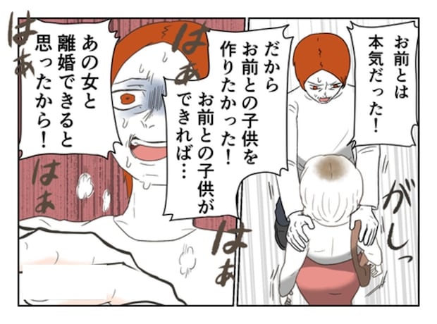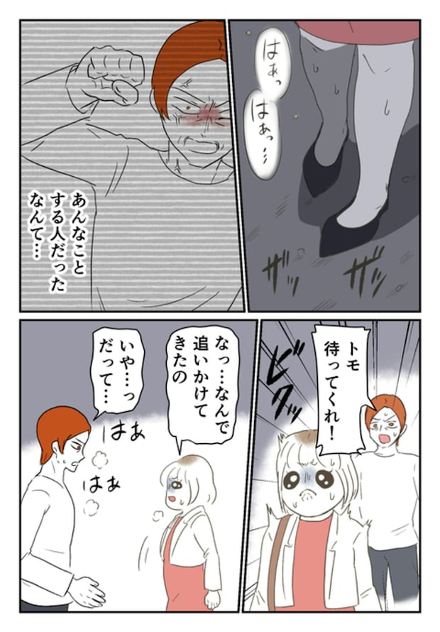 「不倫女」と罵られた尾持さん…。そして、妻を拳で殴るモトさん。その場を逃げ出した尾持さんでしたが、モトさんが追いかけてきます。離婚するために、「尾持さんとの子どもを作りたかった」などと、身勝手なことを言い出し…。