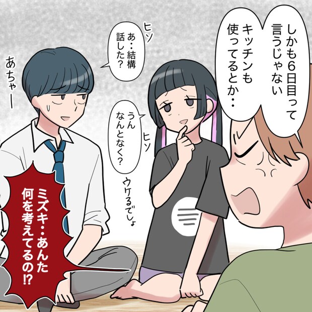 6日も泊っていることや、キッチンを自由に使っていることにも文句を言うと、ミズキは「結構話した?」とマズイな、という顔をしていましたが、悪びれる様子もなくエリカちゃんと話しているので「ミズキ、あんた何を考えてるの!?」と怒りました。