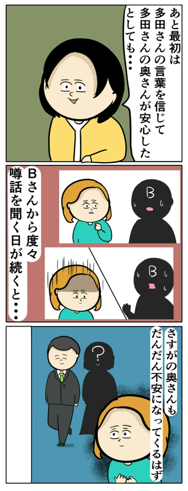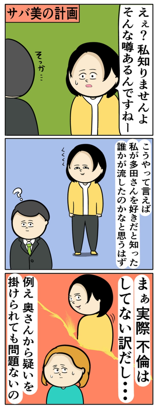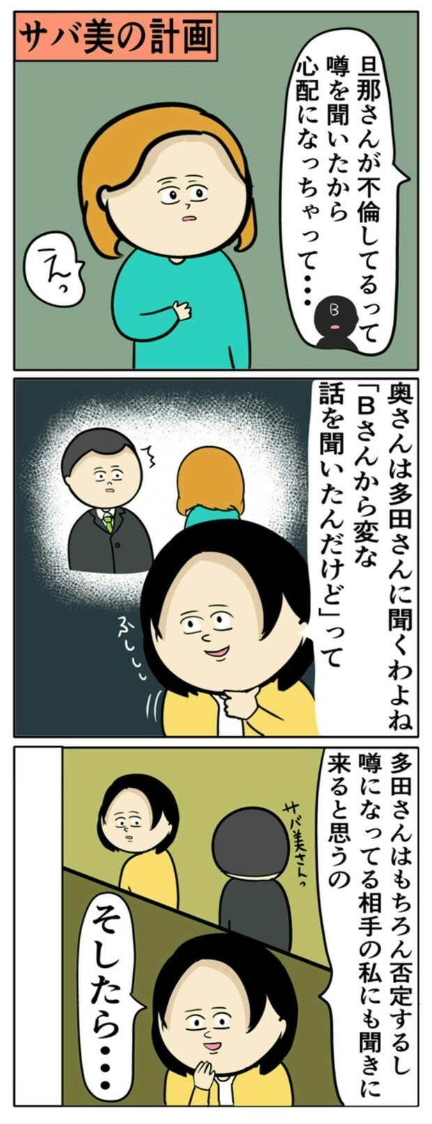 実はBは、多田さんの妻とママ友同士。Bは、専業主婦の多田さんを妬んでおり、今回のサバ美の計画に協力します。そしてサバ美は、あくまで自分は何も知らない体で、周りの気持ちを動かそうと計画。夫のことを信じていても、ママ友から度々よくない噂話を聞かされるのは傷つきますよね。