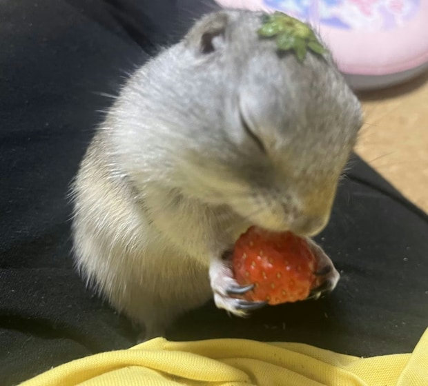 リチャードソンジリスのキャラメルくんも、まるで童話のワンシーンのような愛らしい姿を見せてくれました。イチゴを食べる際に見せてくれたという、謎の表情をごらんください。