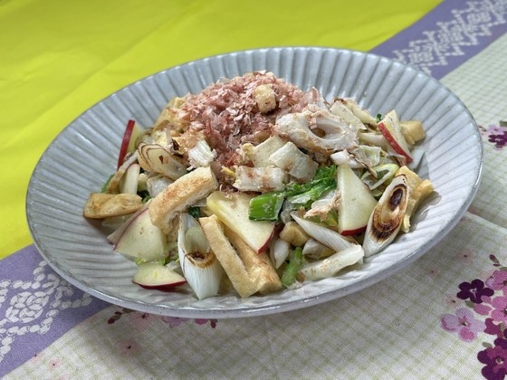 りんごの酸味や、炒めたネギと油揚げの香ばしさがアクセントに。手早く仕上げながらも、技の光るひと品に仕上がりました。