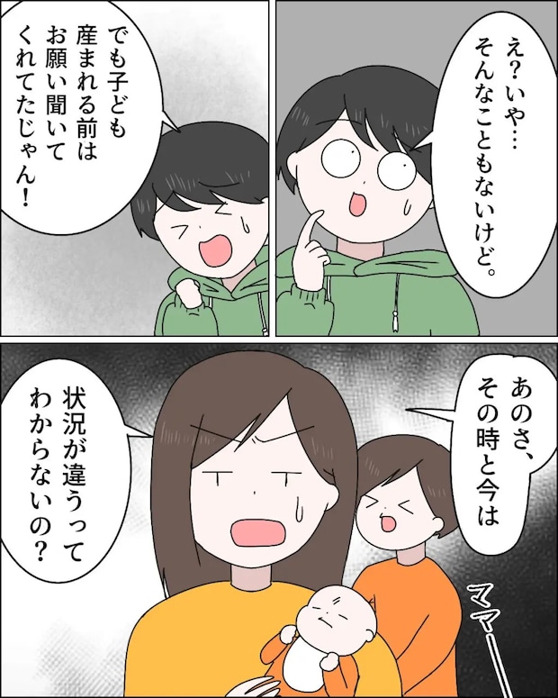 「そんなこともないけど・・・でも、子どもが産まれる前はお願い聞いてくれてたじゃん!」小さな子どものように駄々をこねるマサオ。私は大きくため息をつくと「あのさ、その時と今は状況が違うってわからないの?」と呆れ顔で伝えました。