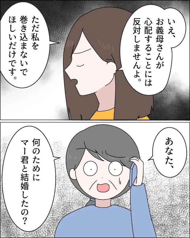 「子どものことはいくつになっても心配」という義母の言い分もわかります。親が我が子を心配する気持ちは年齢を重ねても消えるものではないですし、心配すること自体が悪いわけではありません。ただ、そこに私を巻き込むのをやめてほしいだけなんです。しかし、義母は私の言っていることが理解できないようで、「あなた、何のためにマー君と結婚したの?」と検討違いな返答をします。