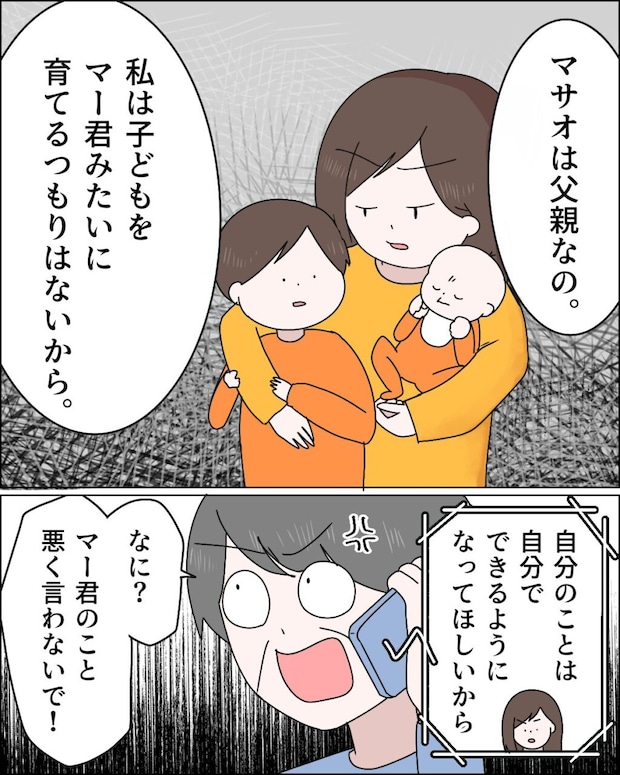 「マサオは父親なの、私は子どもをマー君みたいに育てるつもりはない、自分のことは自分でできるようになってほしいから」そう伝えると、電話の向こうから「なに?マー君のこと悪く言わないで!」と義母が声を荒げました。