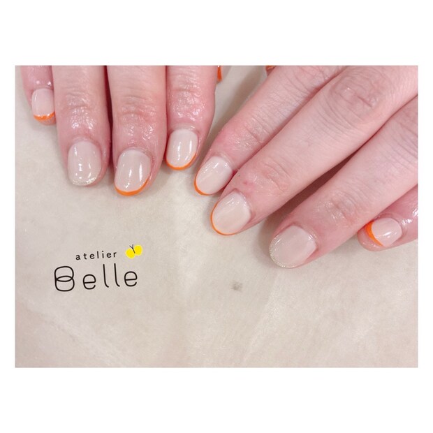 先端にだけオレンジのネイルカラーをラインのように細く入れることで、上品さと遊び心を両立が可能に。
