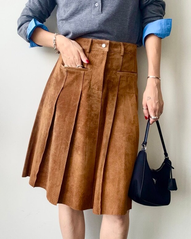 「ブラウンのスエードスカートを軸に、グレーとブルーをレイヤードしたスタイリングに仕上げました。明るめのブラウンに落ち着きあるグレーを掛け合わせることで中和させ、ブルーのシャツを差し色にして軽やかさをプラスしました! 異なるトーンをレイヤードすることで、重くなりがちな秋の配色もモダンで都会的な印象にしています。足元はローファーとソックスで引き締め、大人のクラシックなムードを演出しました」