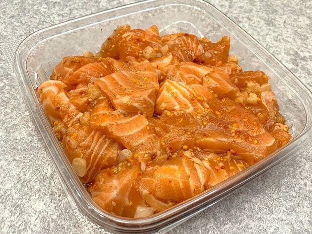 ポキシーズニングとごま油で味付けされた一品。サーモンにプラスして、細かくカットされた玉ねぎも入っています。