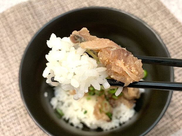 熱々のお茶と出汁が組み合わさって、体がホッとするやさしい味わいに♪さらに、鯵のなめろうの旨味が溶け出したスープがご飯全体に行き渡り、一気に飲み干したくなるような美味しさです!