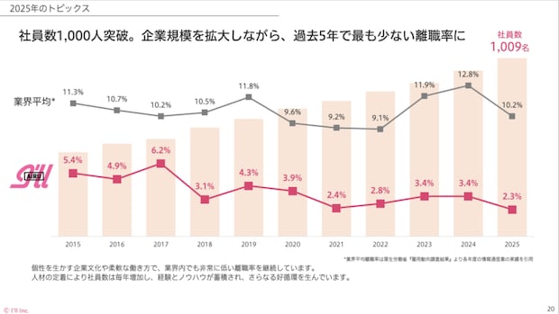 図のように離職率2.3%は業界内でも非常に低い水準を維持していますが、福利厚生の充実や在宅勤務の環境整備など、社員が生き生きと働ける職場づくりに力を入れている成果なのではないでしょうか。