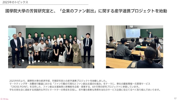 そのほか、國學院大學の芳賀研究室と、「企業のファン創出」に関する産学連携プロジェクトを始動し、たくさん購入してくれる人がファンなのか、それとも購入頻度は高くなくても、口コミで商品や企業の価値を広めてくれる人がファンなのか。など、企業と顧客の関係性やロイヤルティのあり方について、学生ならではの視点も交えながら授業を進めています。