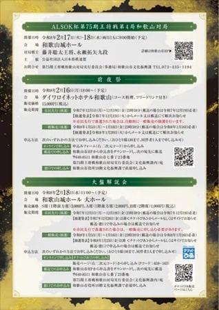 会場はダイワロイネットホテル和歌山。コース料理とフリードリンク付きで、将棋ファンはもちろん、初めて将棋イベントに参加する人でも楽しめるような内容だ。料金は15,000円(税込)で、チケットの販売は一般抽選。専用フォームから、1月5日(月)〜16日(金)の期間で応募できる。