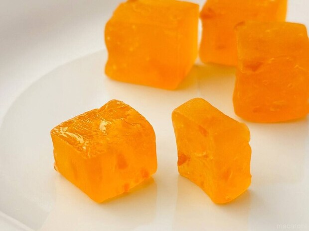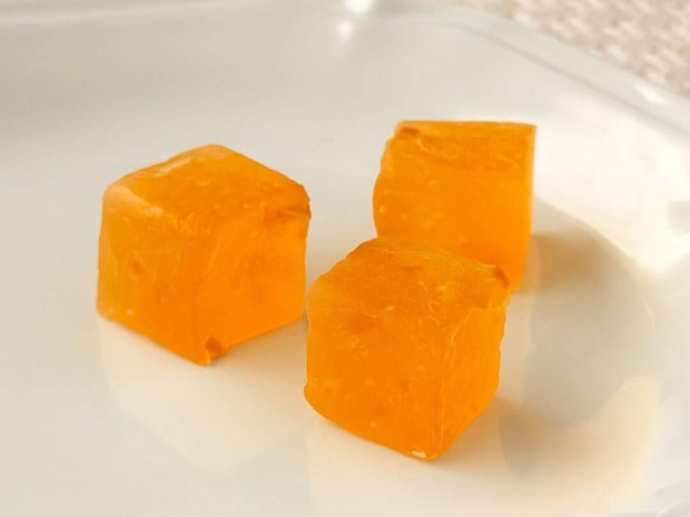 個包装の封を開けた瞬間から、マンゴーのトロピカルで濃厚な香りがしっかりと感じられます。キューブ型のコロンとした見た目で、個包装になっているのも魅力。表面はサラサラしており、やややわらかめの質感でした。