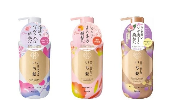 左から、いち髪 なめらかスムースケア シャンプー、いち髪 濃密W保湿ケア シャンプー、いち髪 ダメージリペア&カラーケア シャンプー