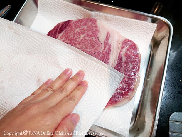その後は常温に戻し、焼く直前に塩・こしょうを両面にまんべんなく。下準備はこれだけ。あとはシンプルに焼いていきます。
