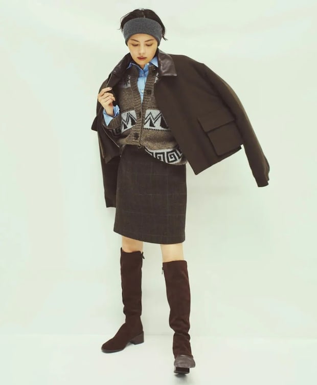 ブルゾン¥165,000(オーラリー)、シャツ¥26,400(アンタイトル)、ニット¥39,600(RHC/RHC ロンハーマン)、スカート¥26,400(ザ シンゾーン/シンゾーン 表参道本店)、ブーツ¥19,800(ル タロン グリーズ/ル タロン グリーズ ルミネ新宿店)、ヘアバンド¥6,930(ラカル/ル タロン 有楽町マルイ店)