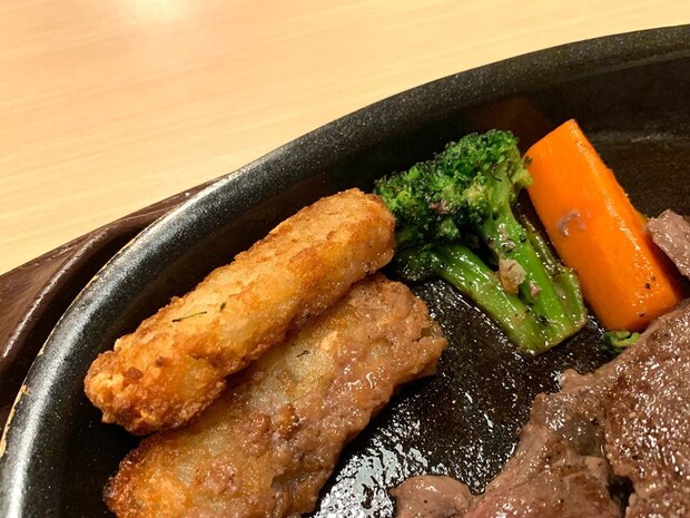 付け合わせはハッシュドポテト、ブロッコリー、にんじんの3種。黒い鉄板の上で熱々になっている付け合わせも絶品です♪