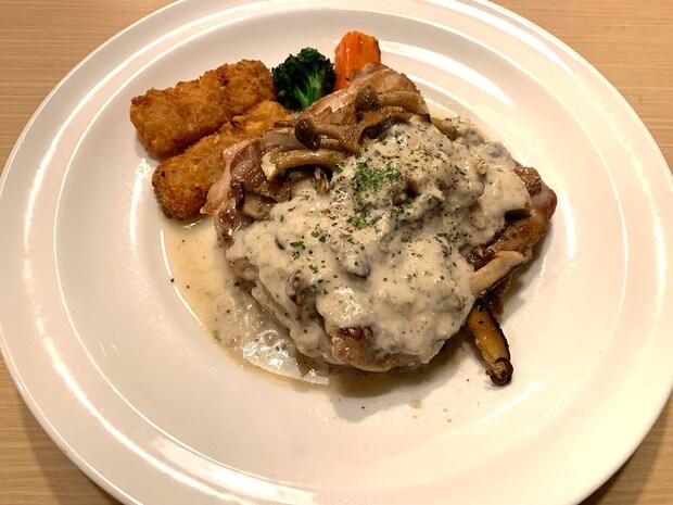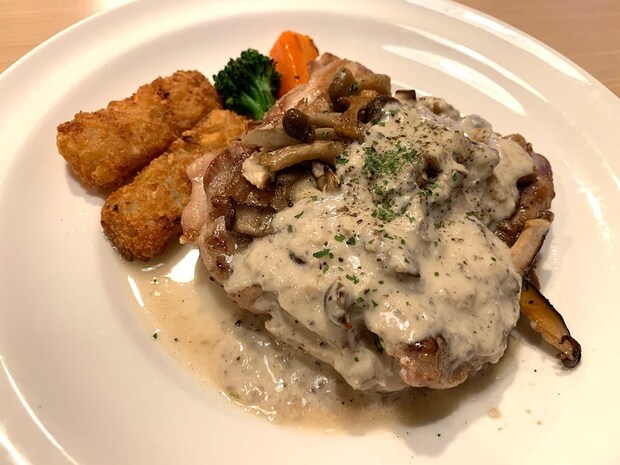 パリッとジューシーな若鶏グリルに、デュクセルソースを合わせた一品。デュクセルソースとは公式サイトによると、”マッシュルーム・しいたけ・舞茸・ポルチーニ茸・トリュフを煮詰め、バター・白ワイン・牛乳・チーズを加えて煮込むことで旨味を凝縮したソース”とのこと。