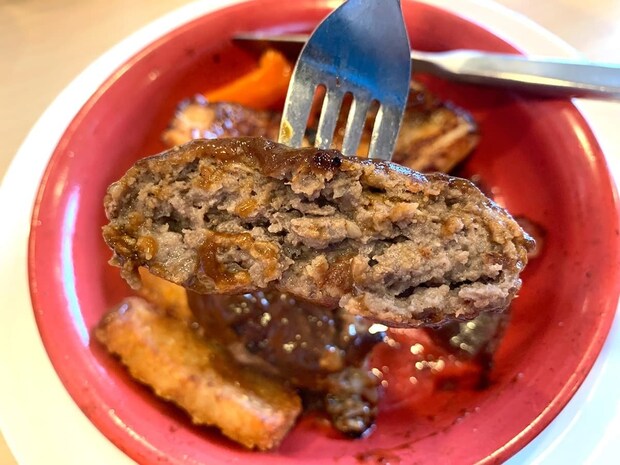 ハンバーグを半分にカットしてみたところ、肉汁たっぷりな断面が!非常に肉厚なハンバーグで、一口ごとの満足感が大きいのも特徴的です。