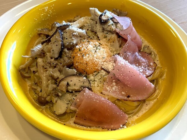 デュクセルソースと生クリームをベースとしたソースに、生パスタを組み合わせた「6種きのこと炙り生ハムのカルボナーラ」です。