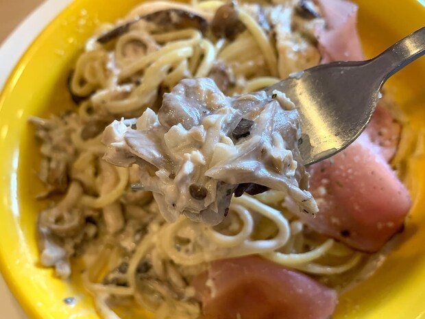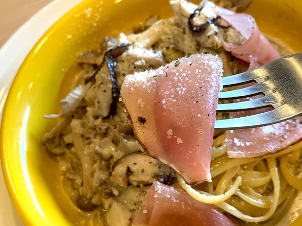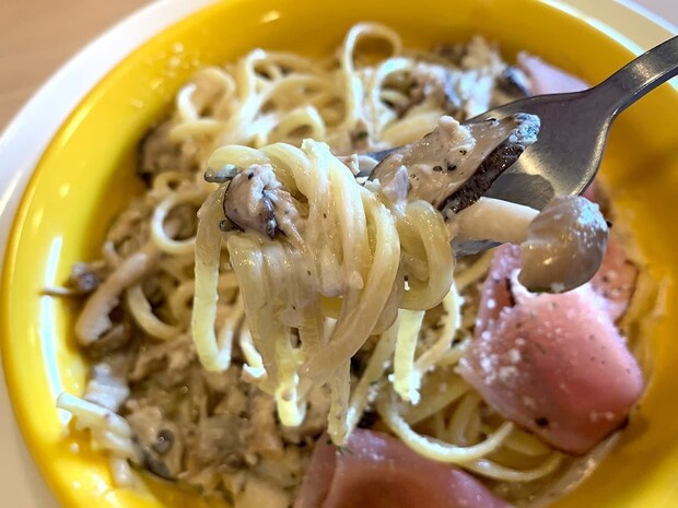 ソースは非常にクリーミーな質感で、具材にはきのこもたっぷり♪きのこが好きな方にはたまらない一品です!
