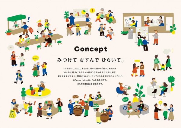 人や地域の魅力に「みつけて」出会い、関係が「むすばれ」、やがてそのつながりが新しい活動や挑戦へと「ひらいて」いく——。「8Peaks living」は、“完成された施設”ではなく、使われ続けることで価値が育まれていく“駅前の開かれた公共空間”を目指すとのこと。