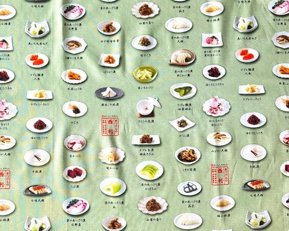 京漬物の代名詞である「千枚漬」をはじめとしたたくさんの漬物が名称付きでデザインされた柄と、