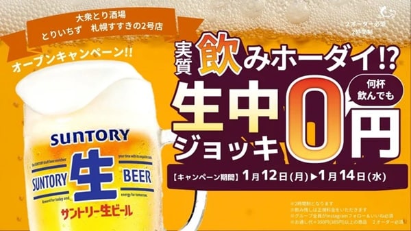 同店ではオープンを記念して、1月12日(月)〜14日(水)の3日間限定で「何杯飲んでも生ビール0円」キャンペーンを開催する。