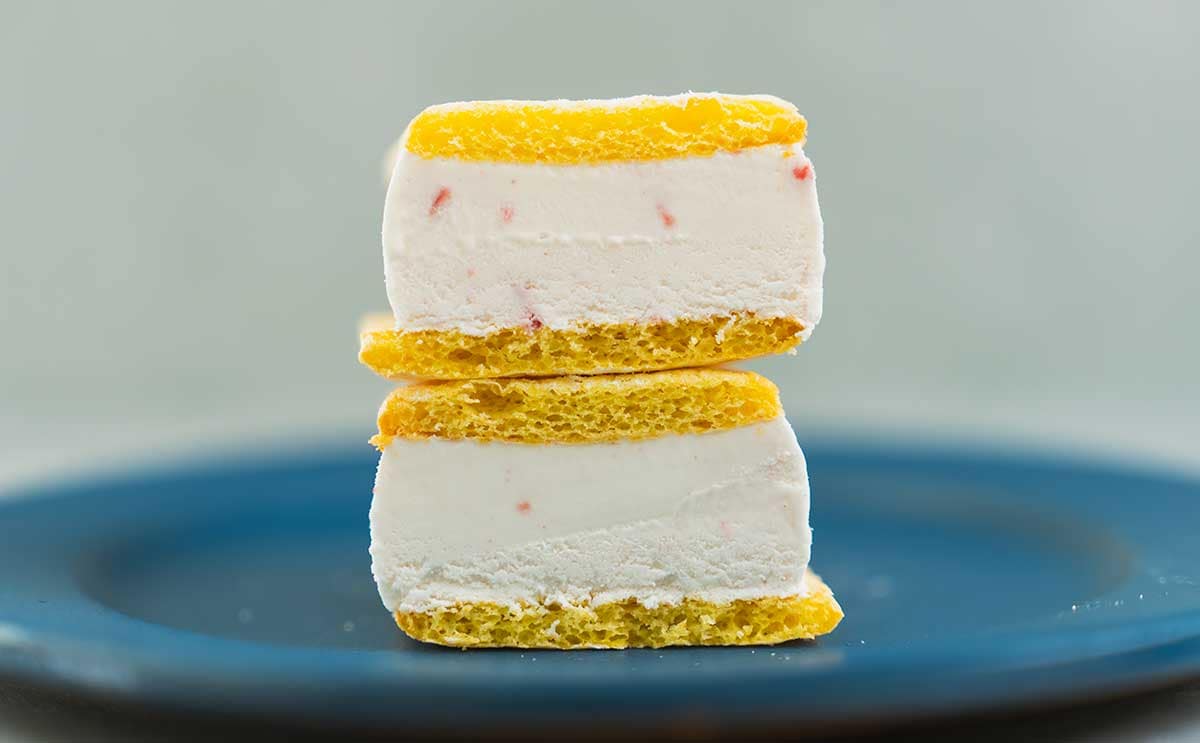 ケーキは、冷凍庫から取り出した直後でもふんわりとした柔らかな食感です。個人的には、ビスキュイ生地のような口当たりに近いなと思いました。アイスはホイップクリームのような甘みとコクがあり、いちごの爽やかな風味も感じられて◎。