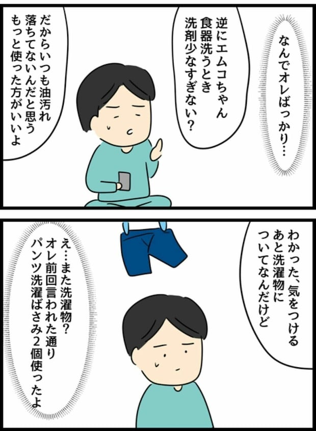 だらしがないと思われていたエスオ君も、エムコちゃんの言動に思うところがありました。掃除や洗濯をやっても常に見張られているように感じ、終われば細かく注意をされてしまう。そうなると「なんでオレばっかり注意されなきゃいけないの?」という気持ちが湧いてきます。