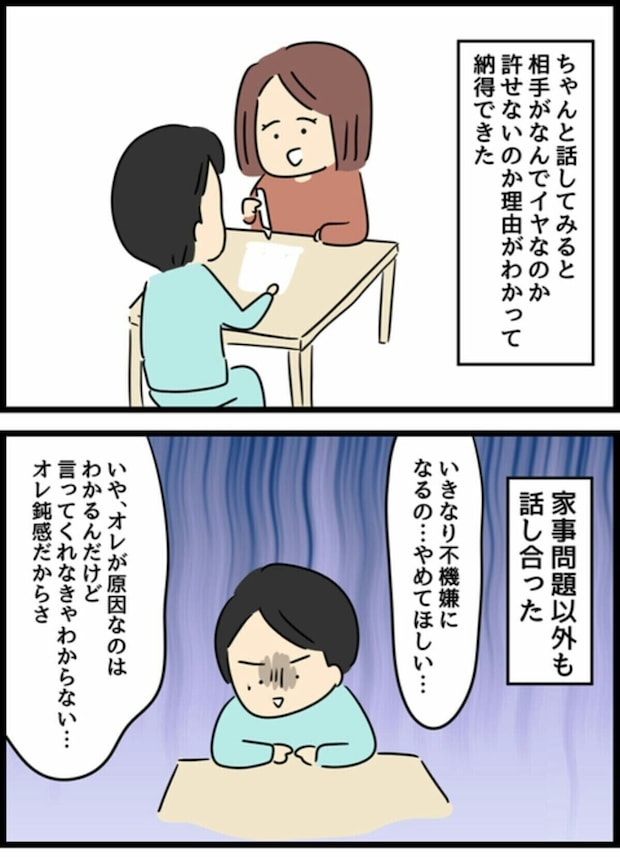 不満を抱えたまま過ごす2人はある日、それぞれの友だちに夫婦の現状について相談をします。その結果、2人に足りていなかったことは「相手への理解」だったと気付きました。