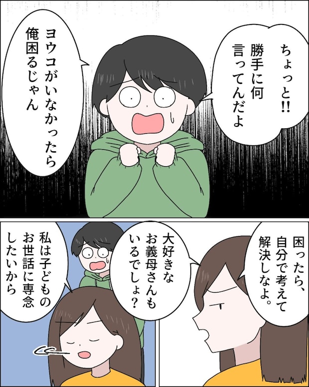 自分に断りもなくお世話を丸投げされたのが気に入らないのか、「ちょっと!勝手に何言ってんだよ、ヨウコがいなかったら俺困るじゃん」と慌てるマサオ。しかし、私はそんな彼に構うことなく「困ったら自分で考えて解決しなよ、大好きなお母さんもいるでしょ?」と冷たく突き放しました。