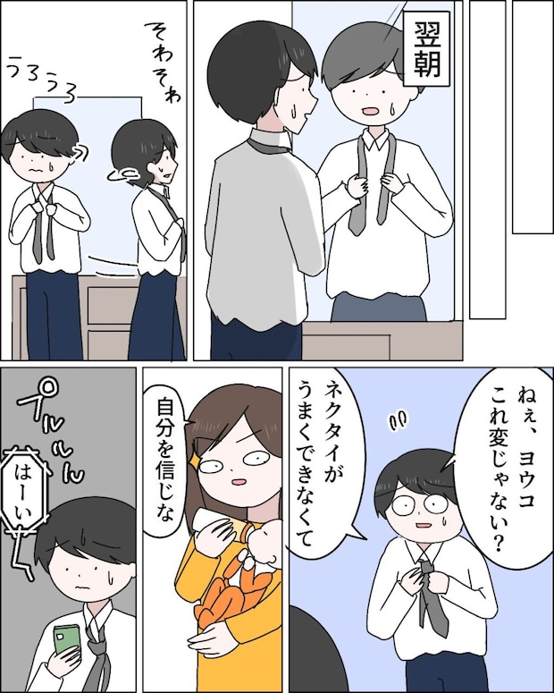 翌朝、自分で身支度を整えるマサオでしたが、ネクタイがうまく結べないのか落ち着かない様子。「ねぇヨウコ、これ変じゃない?」と不安げに聞いてきますが、私は「自分を信じな」とだけ返します。マサオは私に助けてもらえないと悟ると、すぐさま義母に電話をかけ始めました。