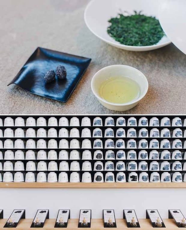 上/柄杓などで湯の温度を調整し、丁寧に淹れる伝統本玉露2,200円。3煎まで楽しめ、煎じた後の茶葉を食すこともできる 下/茶器にもなるパッケージがモダンな 「T., Collection」は茶葉とティーバッグを展開。試飲&テイクアウト可