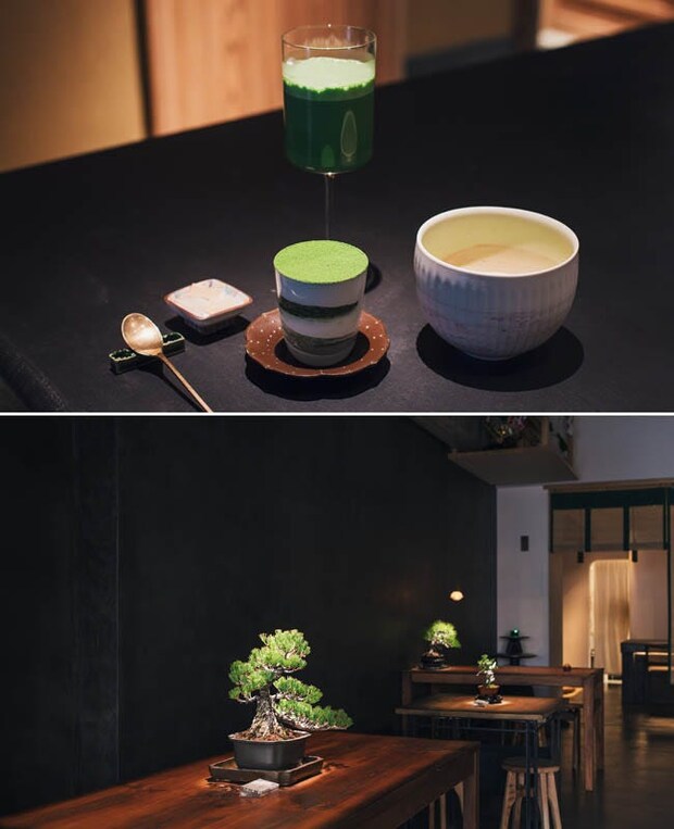 まるでアート作品のような盆栽がいくつも並ぶギャラリーを兼ねた空間で、煎茶や玉露、焙じ茶など全国から選りすぐった日本茶と、素材本来の風味を引き出す多彩なスイーツを。好みの茶碗で楽しめる抹茶は、和服姿のスタッフが目の前で点ててくれる本格派ながら、テーブルやカウンターで味わえるカジュアルさ。抹茶をより身近に感じてみたい。